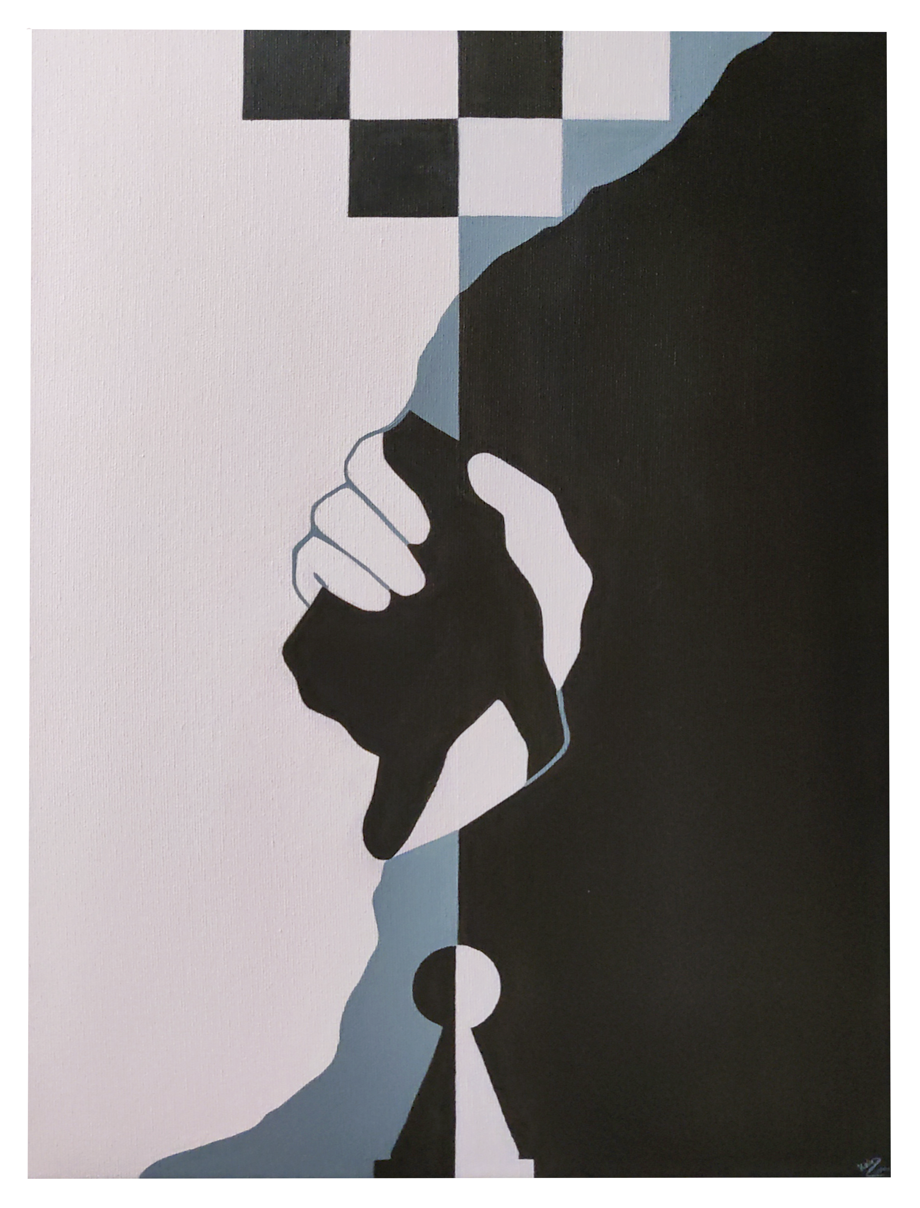 This print called The Game is based on original artwork that is part of the collection The Contact. It was exposed for the first time in Barcelona at 2020. The Game is a work inspired by the Black Lives Matter movement, which was brought about by the death of J. Floyd that occurred during the pandemic. This work reflects on racial contact and social class contact that is represented by two hands that, apparently, are at peace, but the reality is very different. The conflict is not resolved and persists worldwide. It is an infinite chess game of opposing players who are taking steps and nobody knows where. Racism exists no matter how much we pretend otherwise. The gray color is compressed and represents people without prejudice.