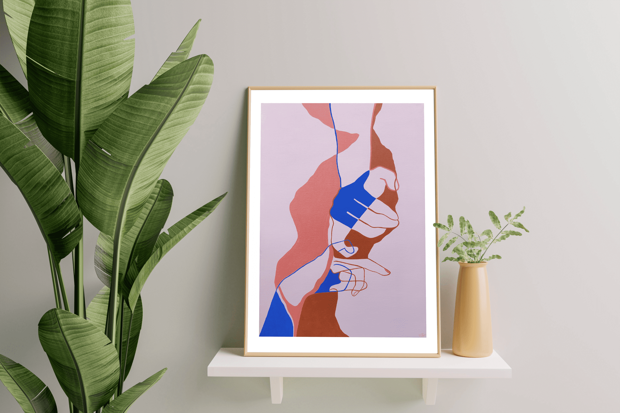 Print called Attachment is based on original painting from the collection The Contact. It was exposed for the first time in Barcelona at 2020. These two linked hands is a couple in love and engaged. As a result transmit their feelings and confidence between them. In other words they trust each other.